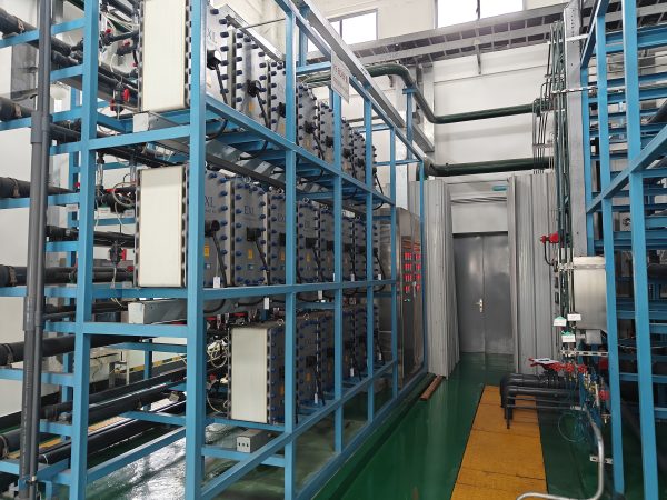 近些年来,在国内市场,EDI设备因其能够连续稳定制备品质优良的超纯水,同时兼具占地面积小,长期运行成本低等优势在石化炼化、电力热力、医药、电子等多个重要行业中得到广泛应用,而在聚焦产品性能本身和现场水处理工艺的同时,EDI装置在撬装设计制造以及安装的环节往往容易忽视。EDI整体撬装设计是一个系统性工程,远不止是将设备简单堆叠在钢架上。它需要综合考虑工艺、机械、电气和自控等多个专业,以实现系统的高度集成化、设备安全平稳运行的可靠性和运维的便利性。本期分别从以下几个维度进行分析,在实际应用中EDI撬装设计需要考虑的关键因素,也欢迎工程公司、撬装设备制造商和用户朋友们共同探讨。 1.水力设计与流量/压力均衡:多模块并联的对称性:进水、浓水、产水母管必须采用对称式布局(如对称式母管),母管式设计。确保到达每个EDI模块的管道阻力和长度基本一致,从而保证每个模块的流量和压力均匀,防止“偏流”。偏流是导致模块损坏的主要原因之一。流速控制:管道直径选择需使水流处于湍流状态(通常1.5-2m/s),以抑制微生物滋生和污染物沉积。压力控制:必须设置产水背压阀,确保产水侧压力始终高于浓水侧压力(通常高0.01-0.03 MPa),防止浓水倒灌污染超纯水。进口需有压力监测,出口需有压力调节。2.防气堵设计:管道布局应避免最高点出现“U”形弯,采用至少水平的走向。在管道系统最高点设置自动排气阀。EDI模块应垂直安装,且建议采用“下进上出”的流向,利用水流自然带出气泡。3.化学清洗系统:尽管EDI不易结垢,但仍需集成一个完整的清洗回路,包括清洗药箱、清洗循环泵和必要的阀门管道。设计应允许对EDI模块进行在线循环清洗,而无需拆卸。 1.撬体结构及设备基础:撬架必须有足够的强度和刚度,以承受设备重量、水重、运行振动以及运输、吊装过程中产生的应力,防止变形。整个撬架底座一般采用槽钢与方管制作,用C型钢固定管道。在设备的吊装过程中,需考虑到设备之间需预留操作维护空间,并在顶部预埋固定用的钢板,钢板尺寸超过槽钢尺寸。2.设备布局与可维护性:检修空间:必须为EDI模块的吊装更换、泵的拆卸、滤芯的更换预留足够的操作和运输空间。靠墙的检修通道最小预留800mm,面板操作中间通道最小在1200mm。管道支撑:对PVDF、CL-PVC等塑料管道,需设计充足的管夹和支撑,防止因热胀冷缩或振动导致管道变形或破裂。3.材料兼容性与污染控制:从EDI模块出口开始,所有与水流接触的部件建议采用高纯度材料,如PVDF、PPH-HP、CL-PVC等,进口管道材质一般为UPVC。密封材料通常选用EPDM。 1.仪表:流量:模块进出口支路的管道式流量计(用于流量调节)、总产水流量计。压力:模块进口、产水出口、浓水出口的压力表或传感器。水质:单个模块在线电阻率仪、总产水在线电阻率仪2.PLC与自动控制逻辑:顺序控制:严格的“先启水,后启电;先断电,后断水”的启停顺序。连锁保护:3.低进水流量/压力保护。高进口电导率保护低产水电阻率保护电源故障保护。运行模式:一般EDI供水水泵为变频设计。4.电气安全:EDI使用直流电,整流器区域必须明确标识并做安全隔离。 撬体必须有良好的接地系统,EDI的电压较高,每个模块电流最高可达 4.5A,除探头需要接地外,所有金属元件也必须接地。电控柜的防护防护等级一般IP54。 水的电解过程会在电极处生成气体(氢气、氧气和少量氯气),一般情况下,单台设备大约每安培的电流产生11.4cm³的气体,其中氢气和氧气的混合气体比例约占2:1 ,这些气体将被极水带到极水出口处,生成氯气的量取决于进水中的氯离子含量。必须对极水采取排气措施,将其中的气体排放到通风良好的地区,以避免气体累积到危险浓度。 因为气体产生的量相对较小,一般通风措施就可以确保氢气的含量低于4%。下面是常规纯水车间环境要求: